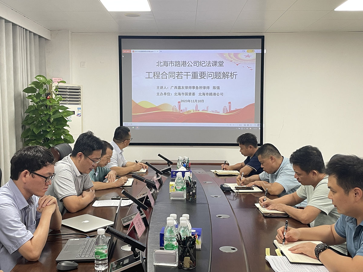 11月10日,北海市路港公司在公司五樓會議室舉辦紀(jì)法課堂專題講座,特邀廣西嘉友律師事務(wù)所陳強(qiáng)律師作題為《工程合同若干重要問題解析》專題講座。公司工程一部、工程二部、發(fā)展部等7個部門50余人參加。